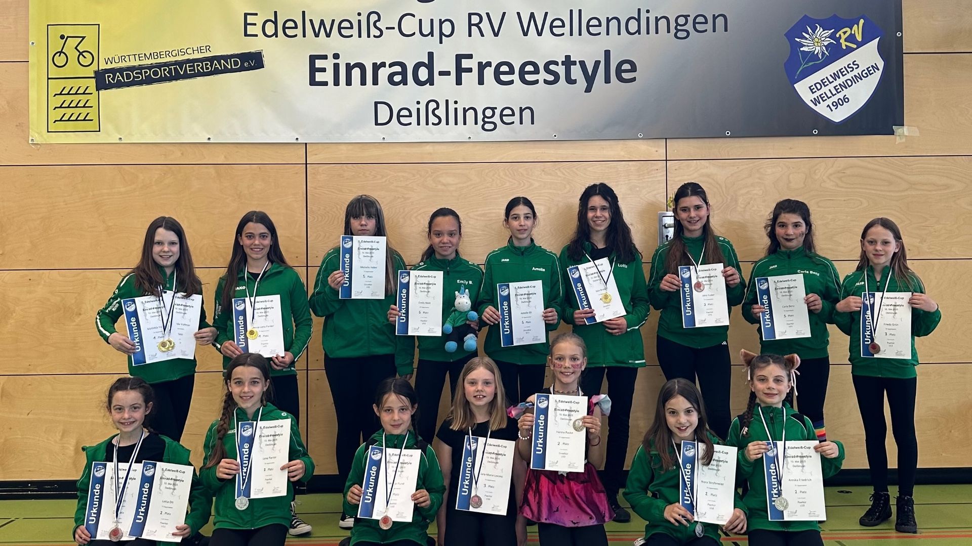 Die Einradgruppe des Turnvereins Appenweier war am vergangenen Wochenende beim Edelweiß Cup in Deißlingen am Start. Der kleine Freestyle-Wettkampf bot den Fahrerinnen und Fahrern erneut die Möglichkeit, ihr Können in Einzel- und Paarküren unter Beweis zu stellen. Die Nachwuchsgruppe präsentierte sich in guter Form und erzielte mit ihren Darbietungen schöne Erfolge. In der technischen Ausführung wie auch im kreativen Ausdruck begeisterten die jungen Sportlerinnen und Sportler sowohl die Jury als auch das Publikum. Die Fahrerinnen und Fahrer zeigten starke Leistungen und konnten sich im Vergleich zu den letzten Wettkämpfen deutlich weiterentwickeln. Der Wettkampf war außerdem eine wertvolle Gelegenheit, weitere Erfahrung zu sammeln und den Austausch mit anderen Vereinen zu pflegen. Der Turnverein Appenweier ist stolz auf die Ergebnisse und freut sich bereits auf die nächsten Herausforderungen im Einradsport. Für kommendes Wochenende steht mit der Badischen Meisterschaft in Elgersweier bereits der nächste Höhepunkt im Wettkampfkalender an. Platzierungen Einzelküren: 2. Platz, EK U10, Hanna Paske 3. Platz, EK U11, Lotta Ott 1. Platz, EK U13, Mathilda Vollmer 5. Platz, EK U13, Amelie Ell 5. Platz, EK U15, Michelle Huber 1.Platz, EK U17, Nile Bruder Platzierungen Paarküren: 2. Platz, PK U10, Annika Friedrich & Nora Strohmaier 3. Platz, PK U10, Salome Fund & Clara-Marie Lorenz 1.Platz, PK U11, Jana Panter & Lotta Ott 2.Platz, PK U13, Frieda Grün & Jana Huber 1. Platz, PK U15, Mathilda Vollmer & Anna-Lena Panter 5. Platz, PK U15, Carla Benz & Emily Bock